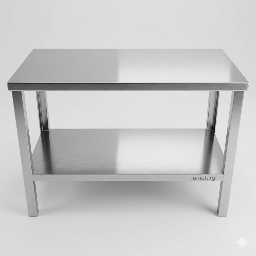 Mesa de acero inoxidable 0.6mm con refuerzo de madera obs 9.5mm, estructura de hierro 30x30mm pintada epoxi termoconvertible, estante de acero inoxidable.