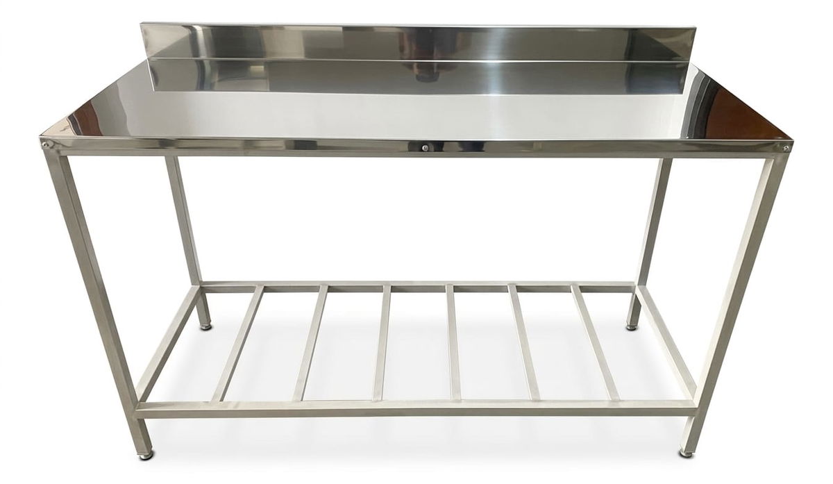 Mesa de acero inoxidable 0.6mm con refuerzo de madera obs 9.5mm, estructura de hierro 30x30mm pintada epoxi termoconvertible, estante de acero inoxidable y zócalo.