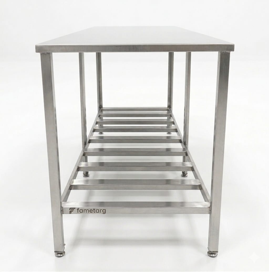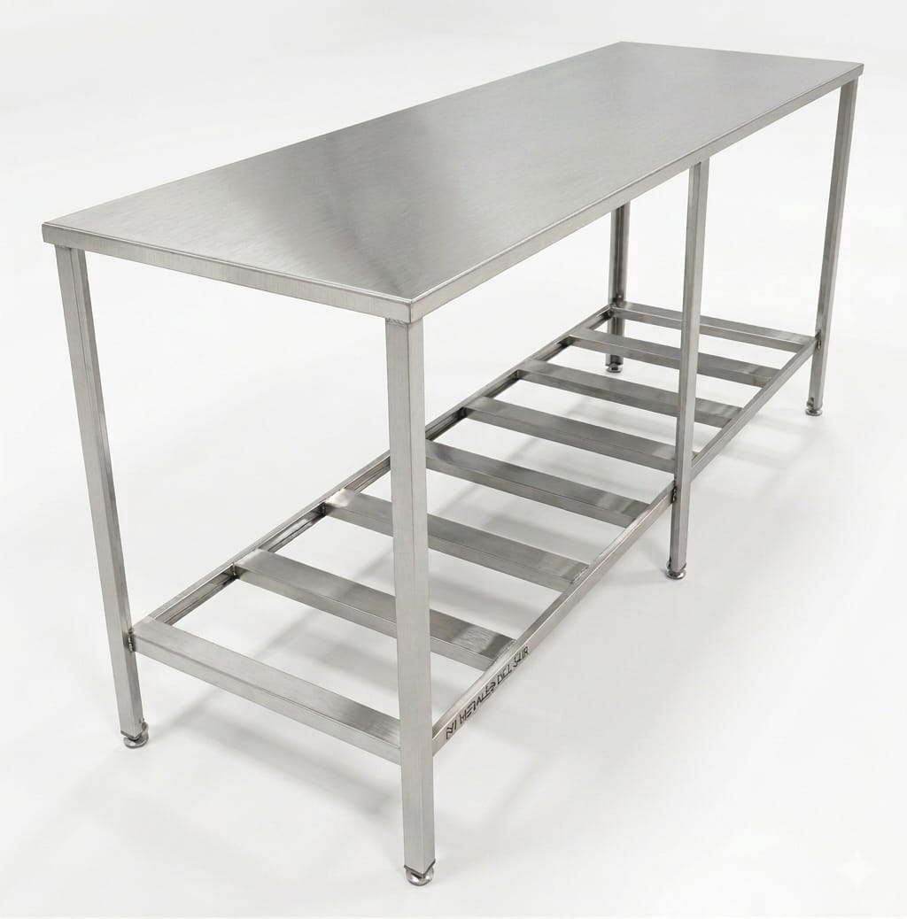 Mesa integramente chapa plegada acero inoxidable 1mm y rejilla.